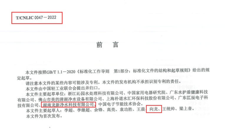 近日,由湖南龍新凈水科技有限公司參編的《綠色設計產品評價技術規范凈化加熱一體式直飲機T/CNLIC0047-2022》、《綠色設計產品評價技術規范軟水機T/CNLIC0046-2022》,經由中國輕工業聯合會發布,被部委采信。